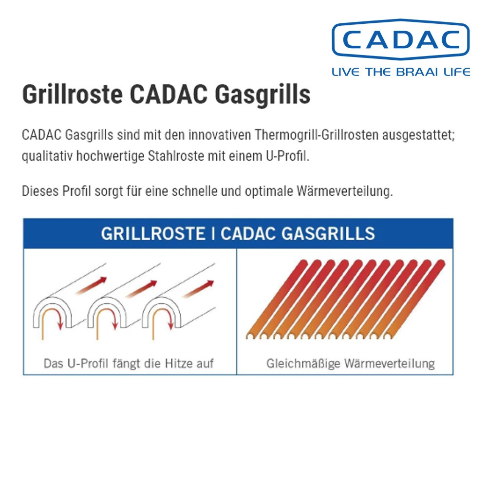 Der Entertainer SUPREME EDELSTAHL hat zwei Thermogrill-Grillroste mit 19,6 x 42cm und einen Thermogrill mit 31x42cm. CADAC Thermogrill ist ein innovatives System, das fĂĽr eine gleichmäßige Wärmeverteilung sorgt. Dein Grill ist deutlich schneller bereit als bei Gussrosten, die sich erst erwärmen mĂĽssen.Â