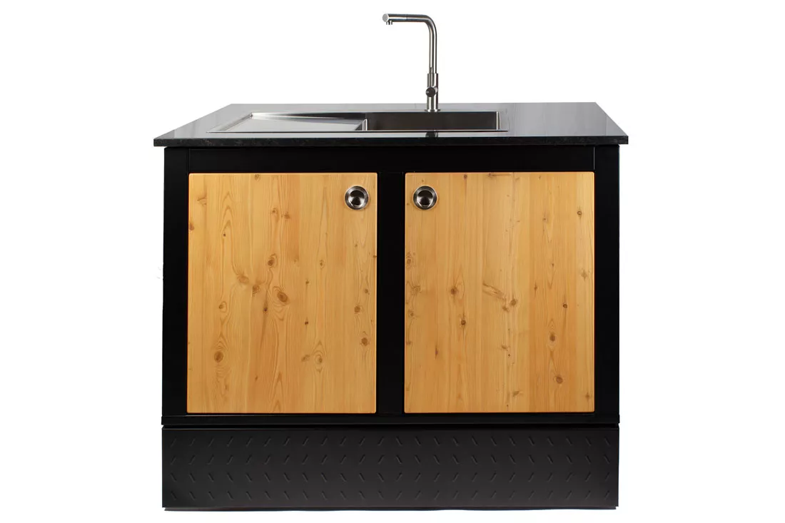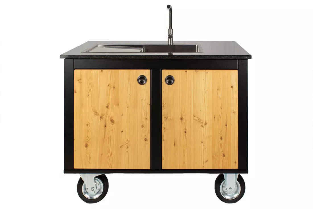 - Material: Granit, Holzteile aus Lärche, pulverbeschichtetem Stahl, Vollgummiräder, Spülbecken aus Edelstahl, Armatur aus Edelstahl
