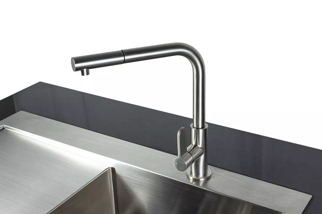 Zu jeder gut ausgestatteten Outdoor Küche gehört ein Spülbecken, zum Händewaschen, Gemüse waschen oder einfach zum abspülen. Das Outdoor Modul Toni ist mit einem Spülbecken aus gebürstetem Edelstahl ausgesattet und hat eine satinierte Oberfläche. Die Armatur ist ein Einhebel-Mischbatterie mit Hochdruck-Armatur, ebenfalls aus gebürstetem Edelstahl.