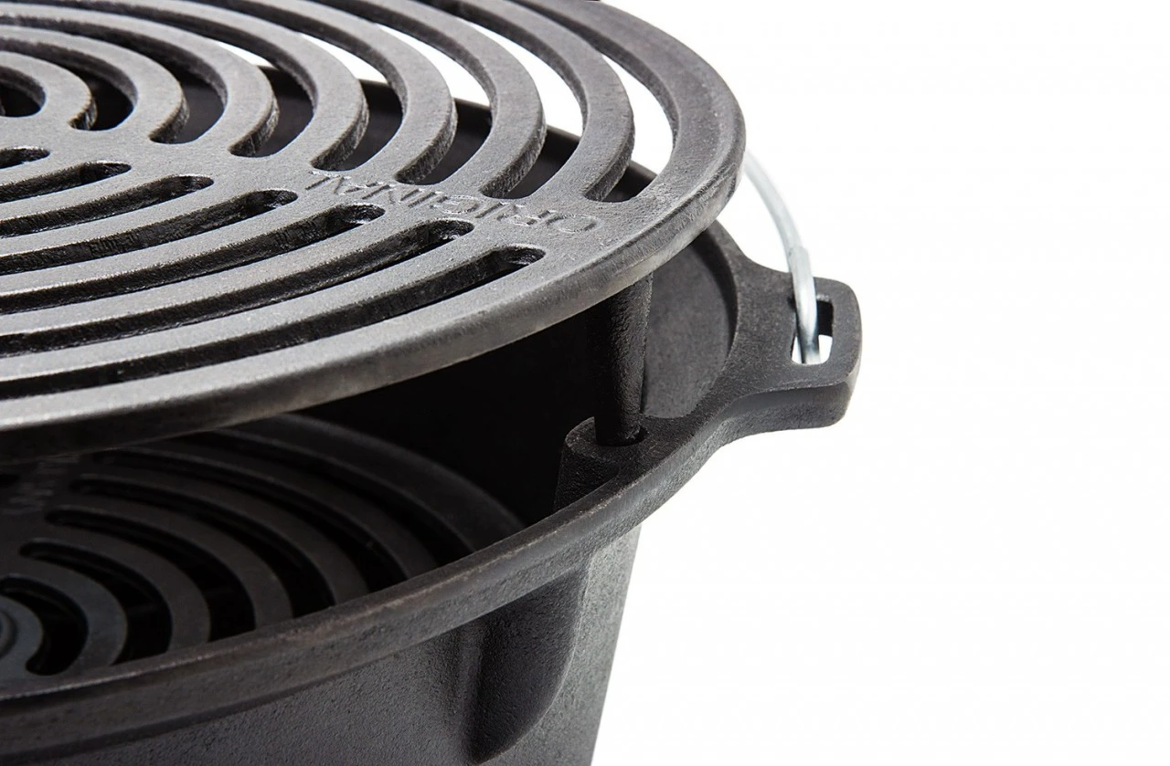 Du kannst den Feuergrill mit einem Feuertopf (Dutch Oven) kombinieren, sodass die hervorragende Wärmespeicherung das Kochen besonders energiesparend macht.